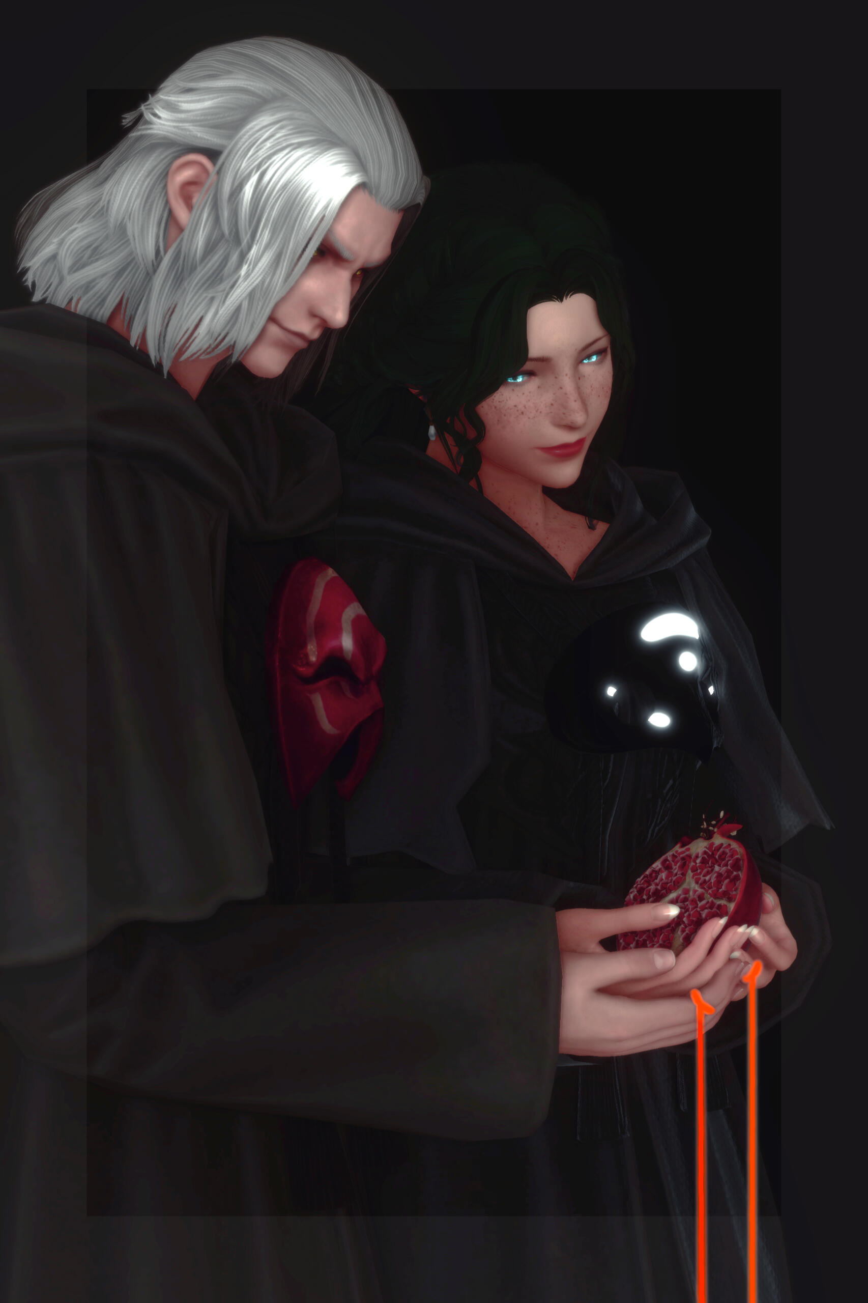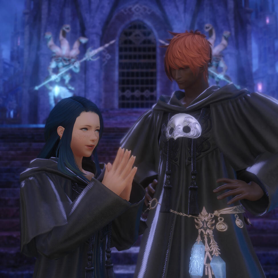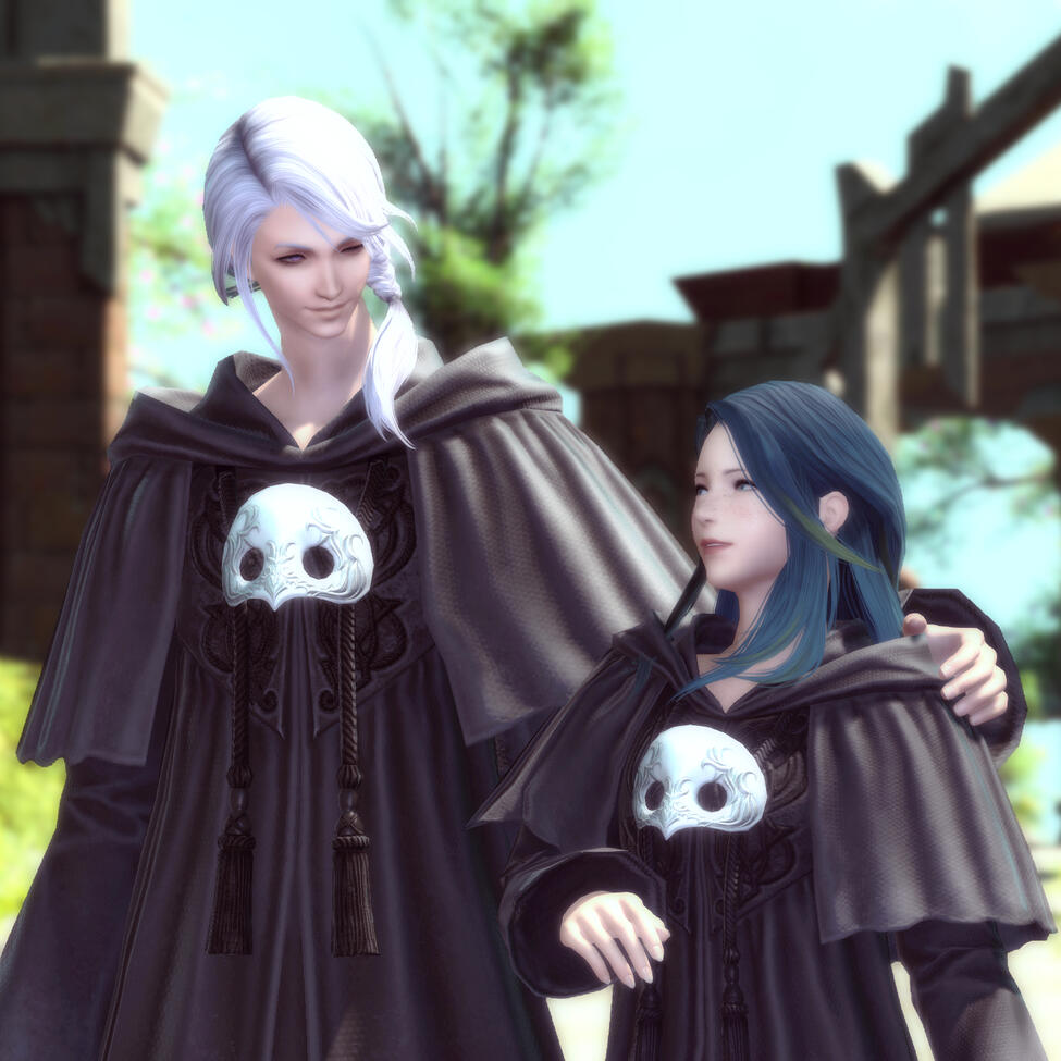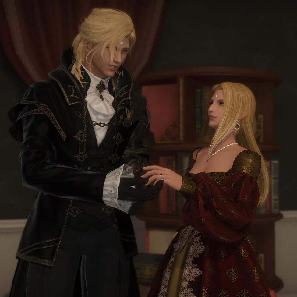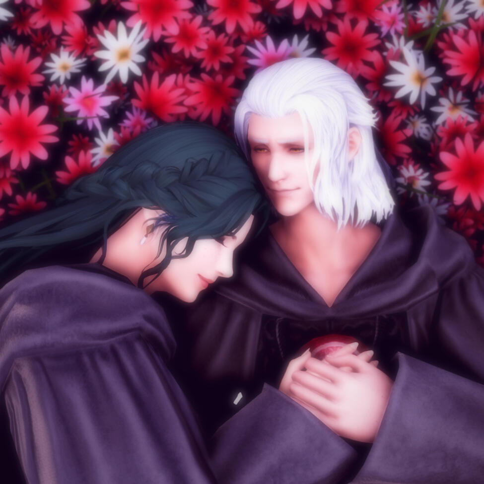 There is a rare but special partnership some few privileged Ancient souls experience called soul bonding. Though the phenomenon puzzles even the most knowledgeable scholars of Etheirys, it is an undeniable bond that's born of the purest love, respect, and adoration. Their souls would reach out to one another in a warm embrace, coalescing together to share each other's emotions and experiences in the most beautiful way. It is believed that this love transcends time itself. Persephone and Hades are two such souls that finally understand this tug at their souls after Hades ascends to the seat of Emet-Selch. For many years did their love blossom, that admiration for each other's differences and strengths flourishing akin to a beautiful bloom. For Persephone, it was his compassion for their star and his sentimental heart that drew her to him. As for Hades, he fell in love with the brightness of her soul and her strong convictions. He now wears one of her signature earrings, each bearing one of the pair for their newfound partnership. To say the least, Hythlodaeus is not shocked at all by these turn of events.