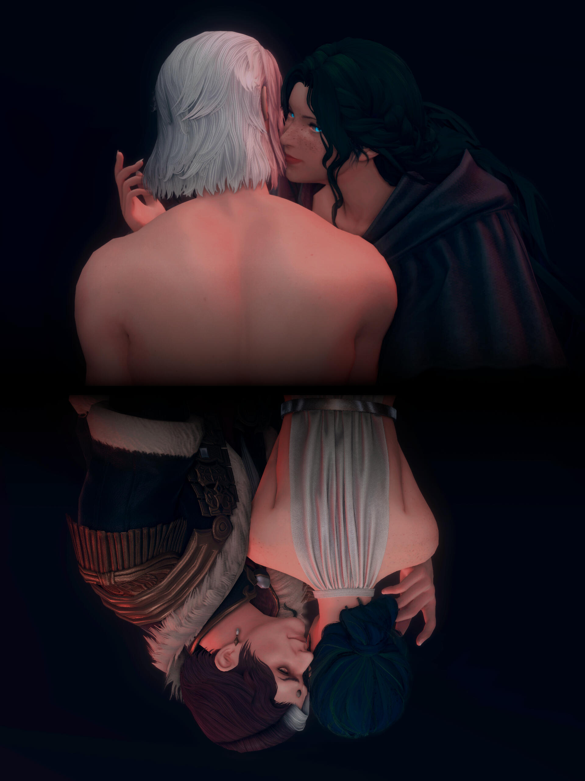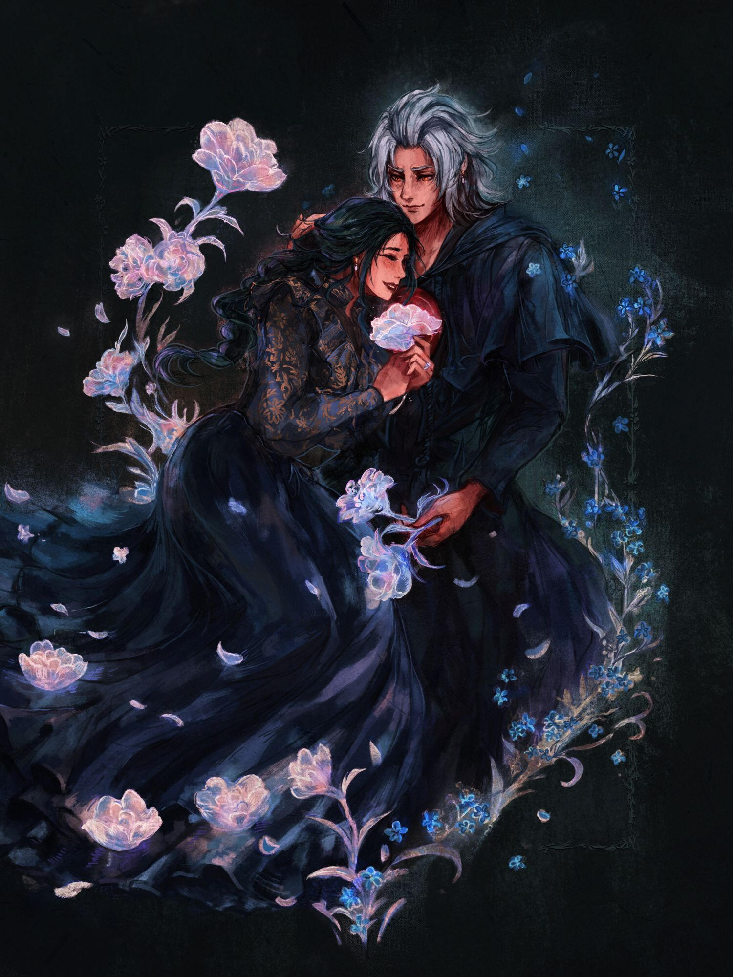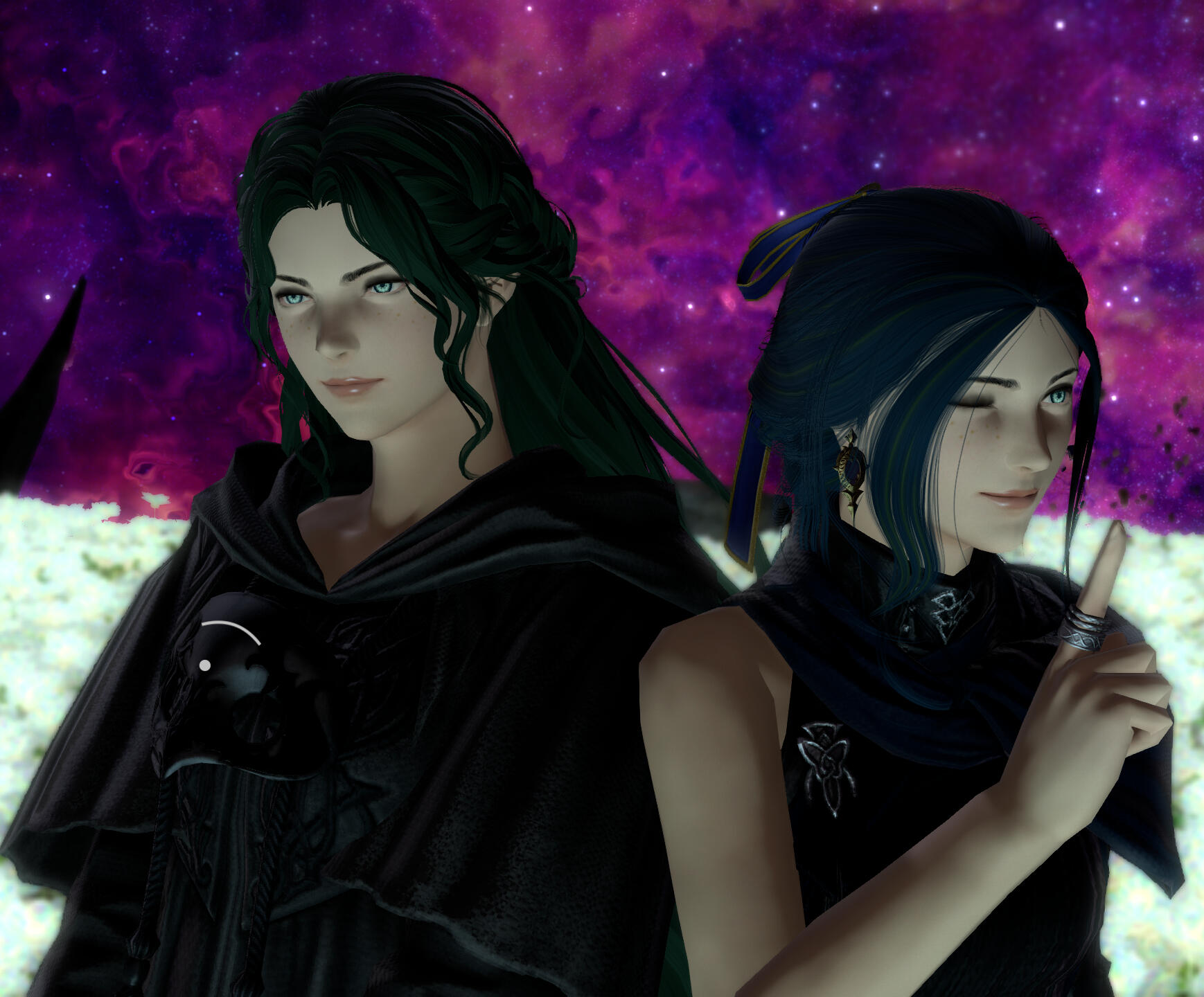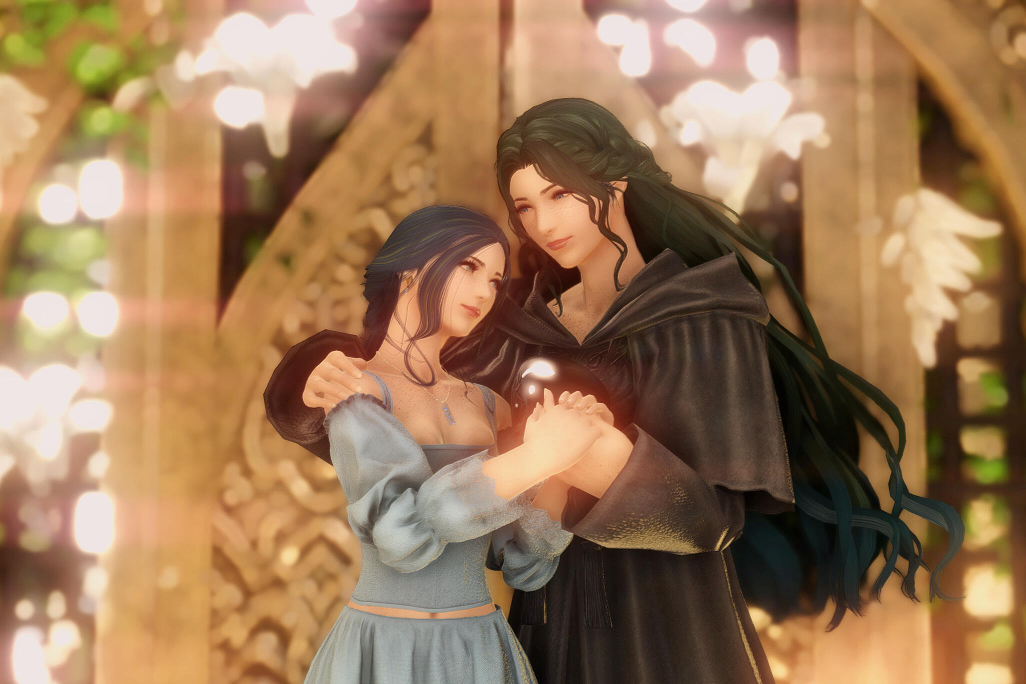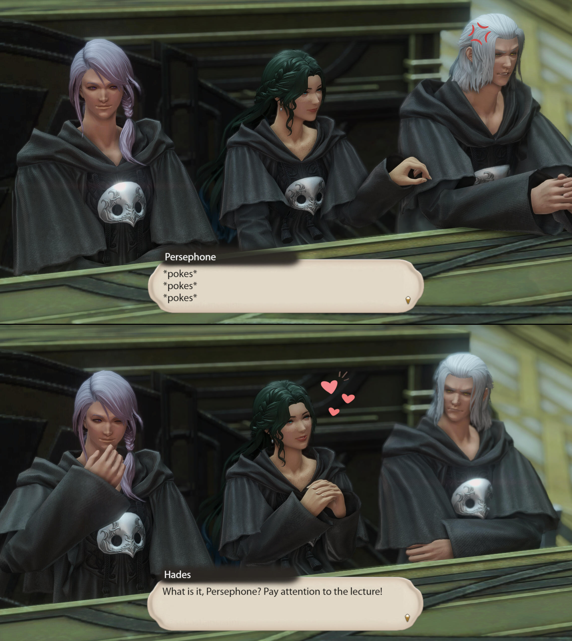 There is a rare but special partnership some few privileged Ancient souls experience called soul bonding. Though the phenomenon puzzles even the most knowledgeable scholars of Etheirys, it is an undeniable bond that's born of the purest love, respect, and adoration. Their souls would reach out to one another in a warm embrace, coalescing together to share each other's emotions and experiences in the most beautiful way. It is believed that this love transcends time itself. Persephone and Hades are two such souls that finally understand this tug at their souls after Hades ascends to the seat of Emet-Selch. For many years did their love blossom, that admiration for each other's differences and strengths flourishing akin to a beautiful bloom. For Persephone, it was his compassion for their star and his sentimental heart that drew her to him. As for Hades, he fell in love with the brightness of her soul and her strong convictions. He now wears one of her signature earrings, each bearing one of the pair for their newfound partnership. To say the least, Hythlodaeus is not shocked at all by these turn of events.