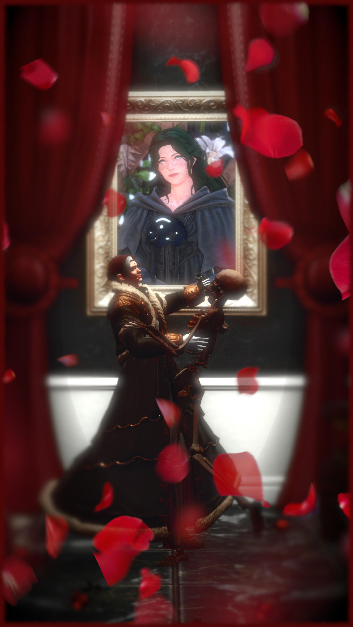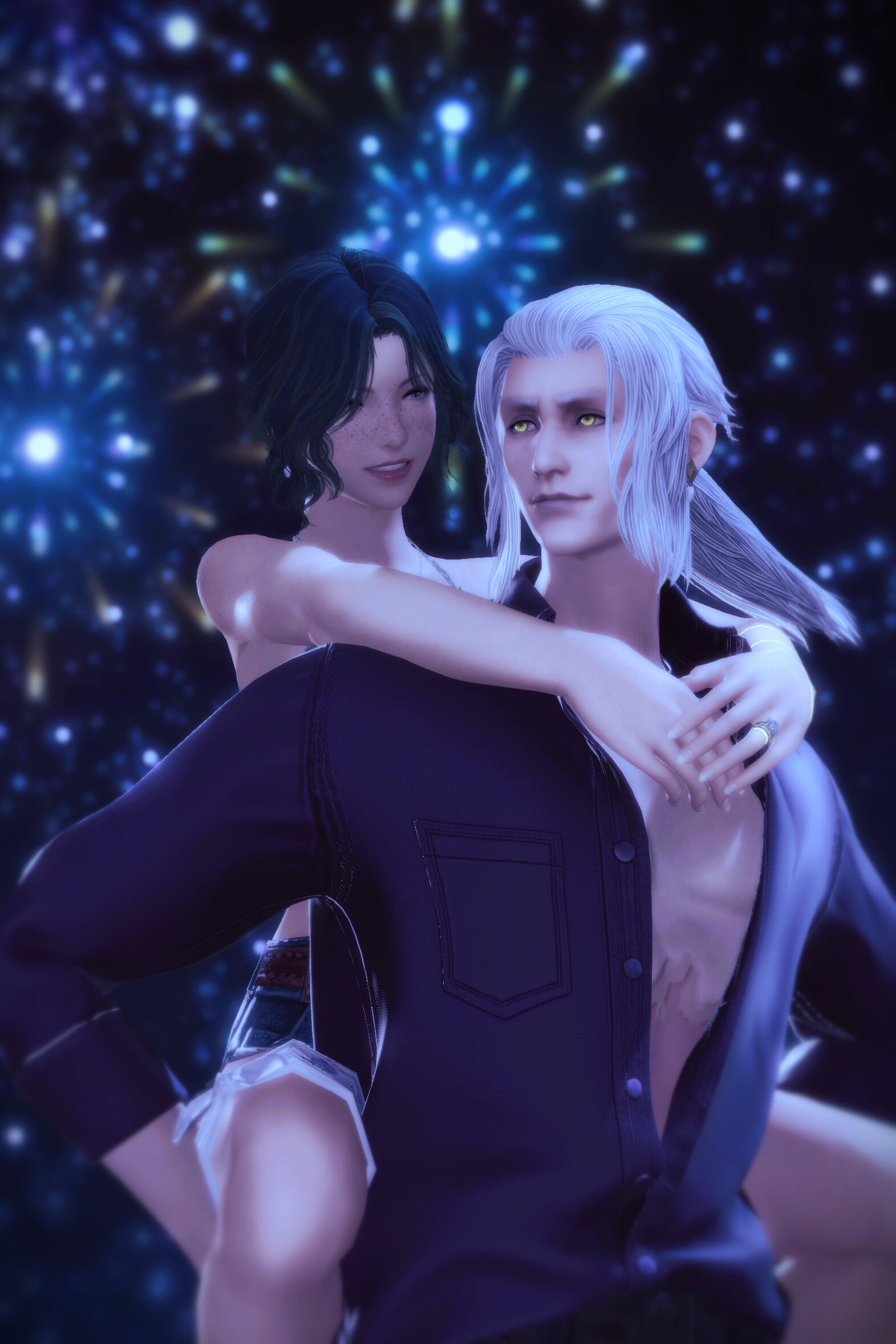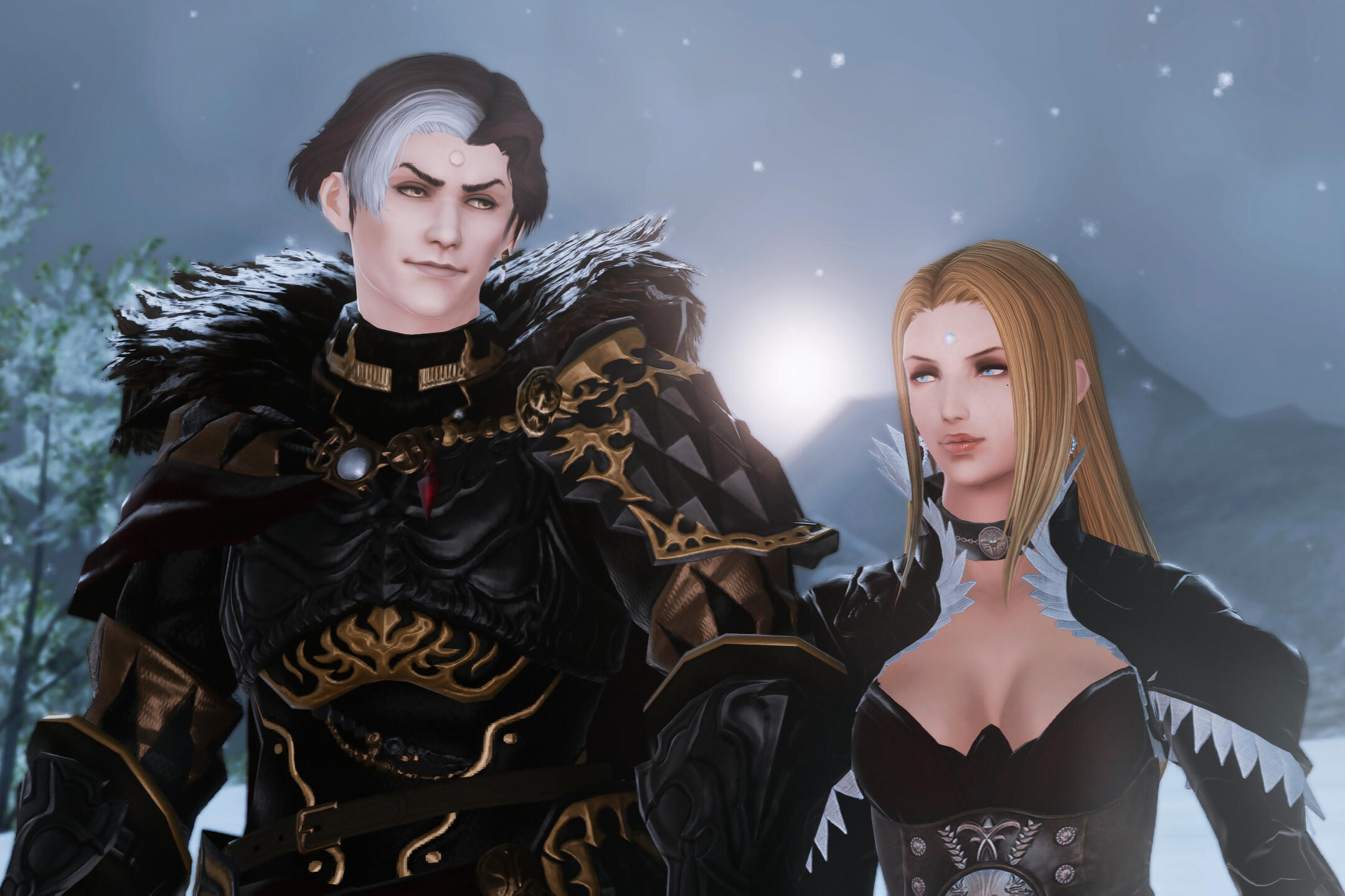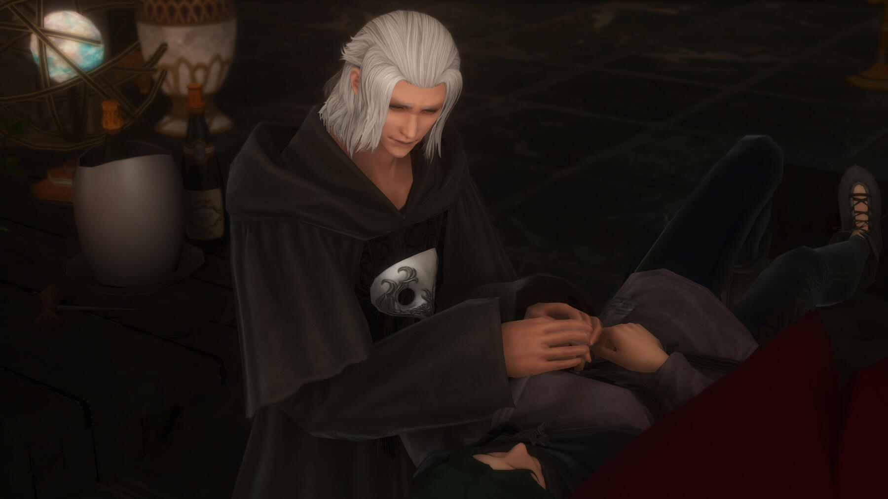 There is a rare but special partnership some few privileged Ancient souls experience called soul bonding. Though the phenomenon puzzles even the most knowledgeable scholars of Etheirys, it is an undeniable bond that's born of the purest love, respect, and adoration. Their souls would reach out to one another in a warm embrace, coalescing together to share each other's emotions and experiences in the most beautiful way. It is believed that this love transcends time itself. Persephone and Hades are two such souls that finally understand this tug at their souls after Hades ascends to the seat of Emet-Selch. For many years did their love blossom, that admiration for each other's differences and strengths flourishing akin to a beautiful bloom. For Persephone, it was his compassion for their star and his sentimental heart that drew her to him. As for Hades, he fell in love with the brightness of her soul and her strong convictions. He now wears one of her signature earrings, each bearing one of the pair for their newfound partnership. To say the least, Hythlodaeus is not shocked at all by these turn of events.
