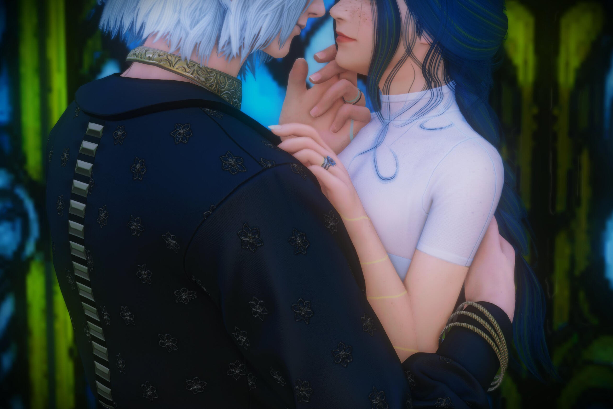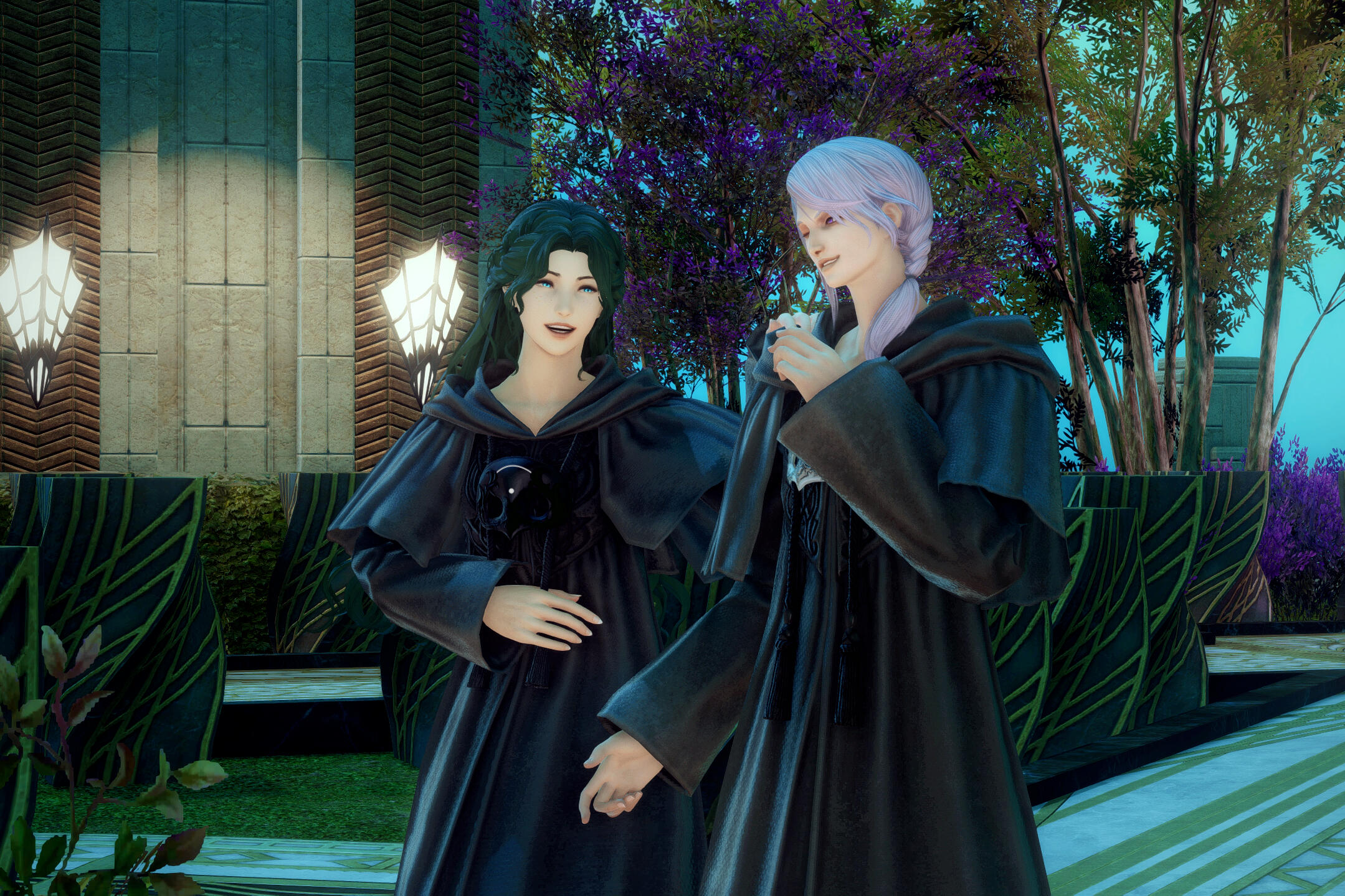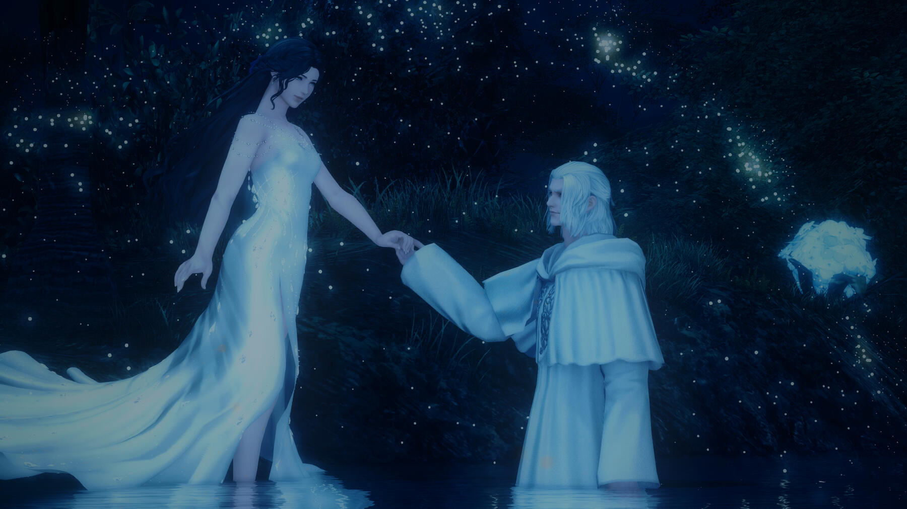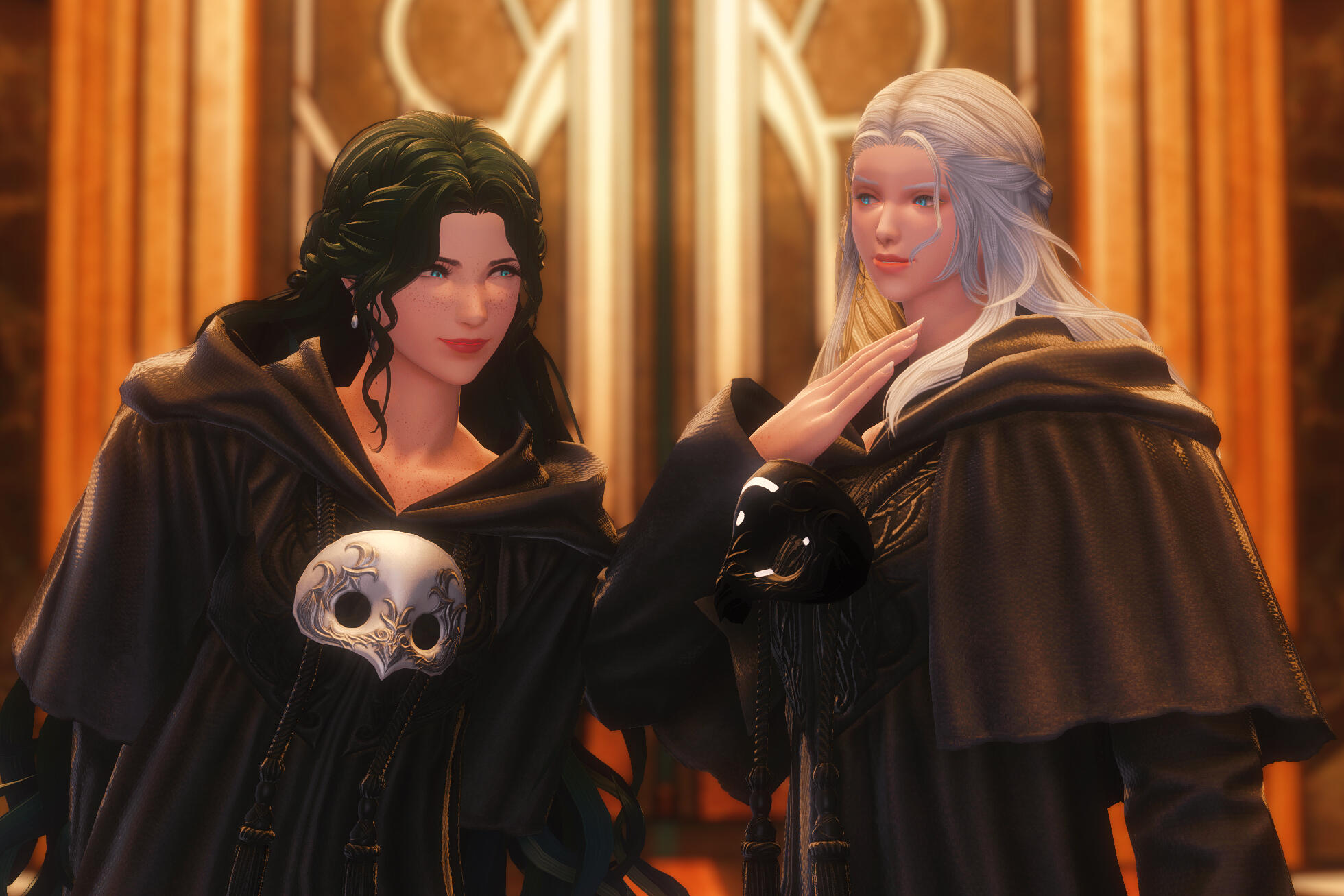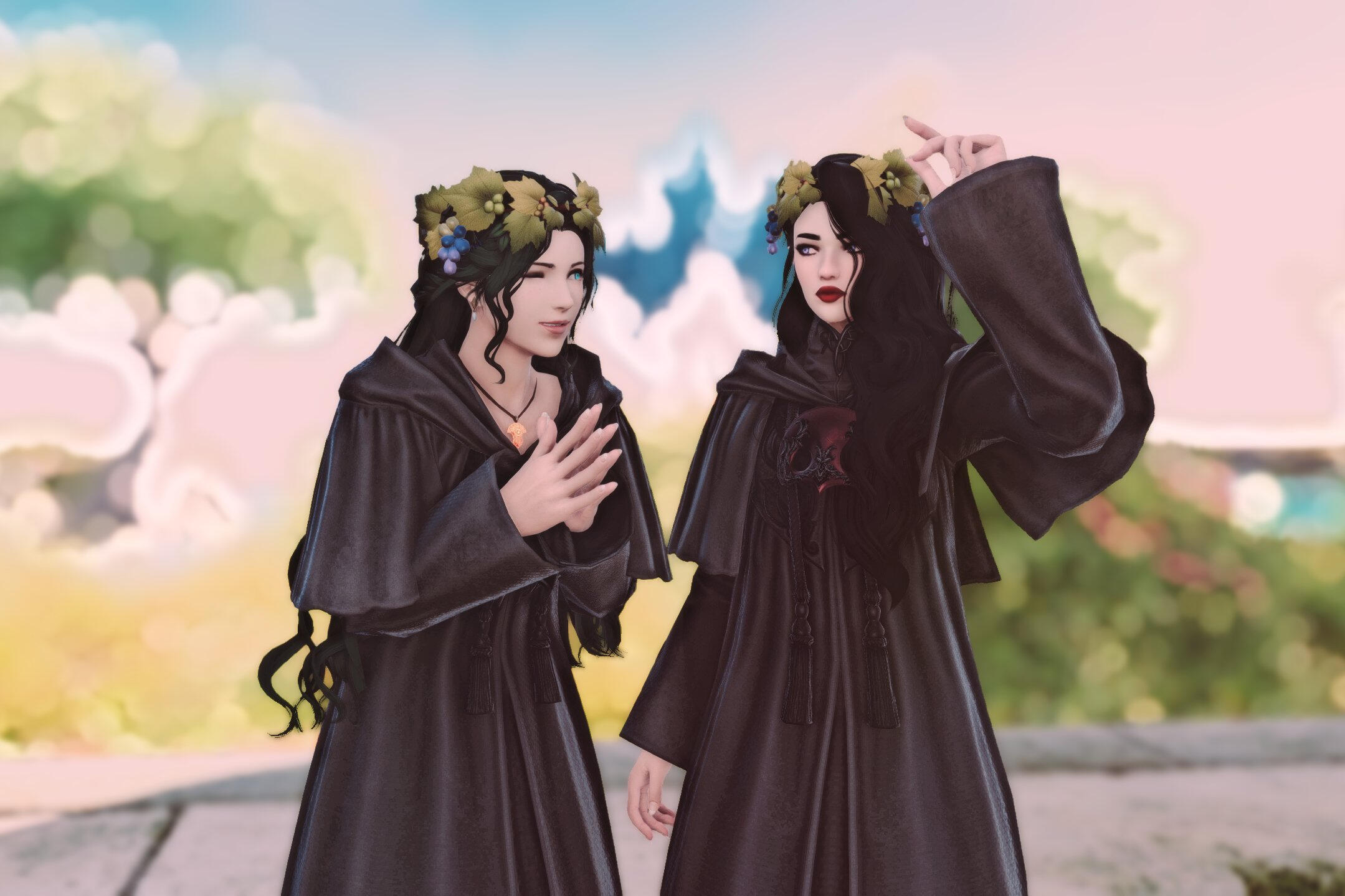 There is a rare but special partnership some few privileged Ancient souls experience called soul bonding. Though the phenomenon puzzles even the most knowledgeable scholars of Etheirys, it is an undeniable bond that's born of the purest love, respect, and adoration. Their souls would reach out to one another in a warm embrace, coalescing together to share each other's emotions and experiences in the most beautiful way. It is believed that this love transcends time itself. Persephone and Hades are two such souls that finally understand this tug at their souls after Hades ascends to the seat of Emet-Selch. For many years did their love blossom, that admiration for each other's differences and strengths flourishing akin to a beautiful bloom. For Persephone, it was his compassion for their star and his sentimental heart that drew her to him. As for Hades, he fell in love with the brightness of her soul and her strong convictions. He now wears one of her signature earrings, each bearing one of the pair for their newfound partnership. To say the least, Hythlodaeus is not shocked at all by these turn of events.