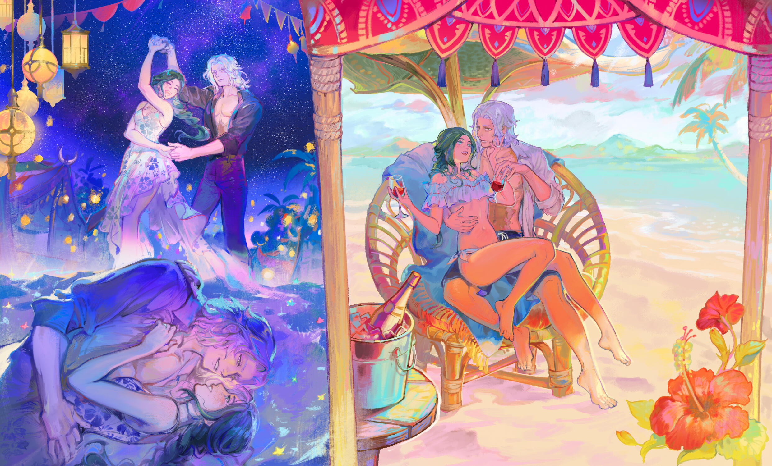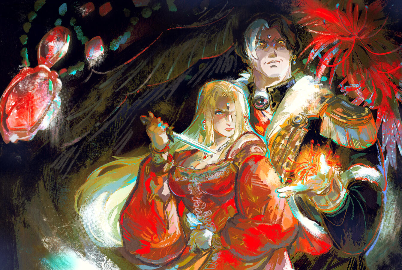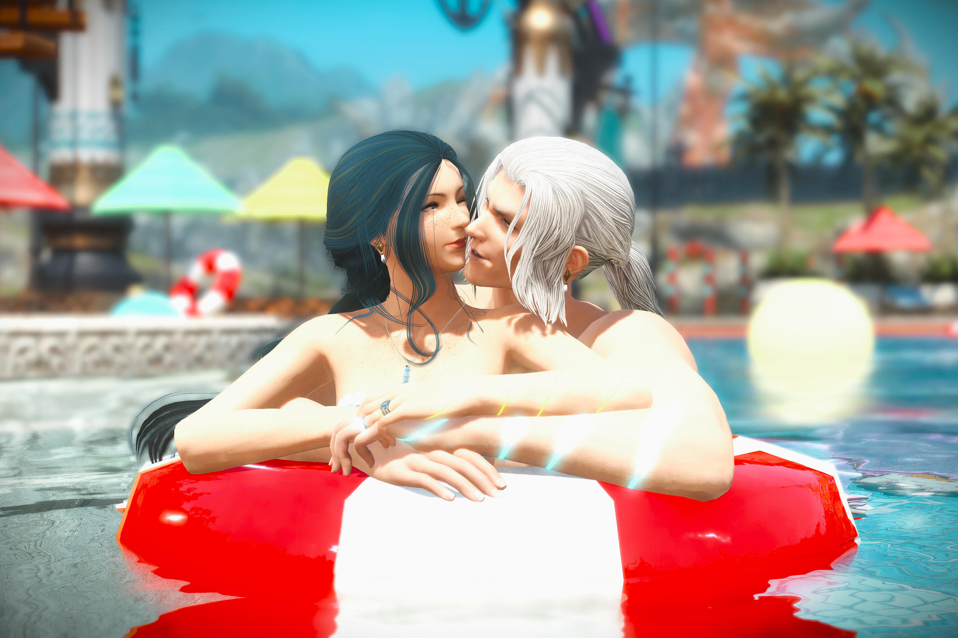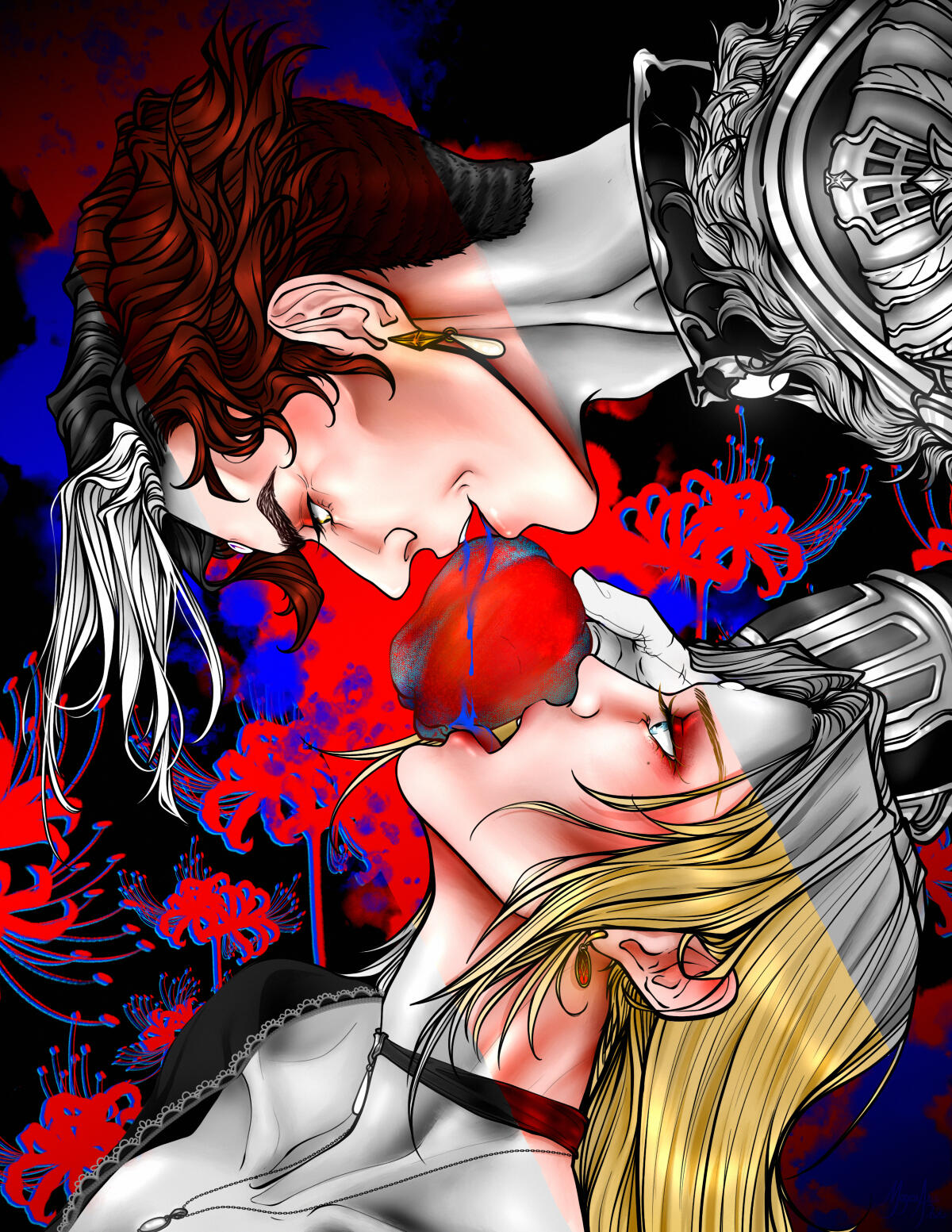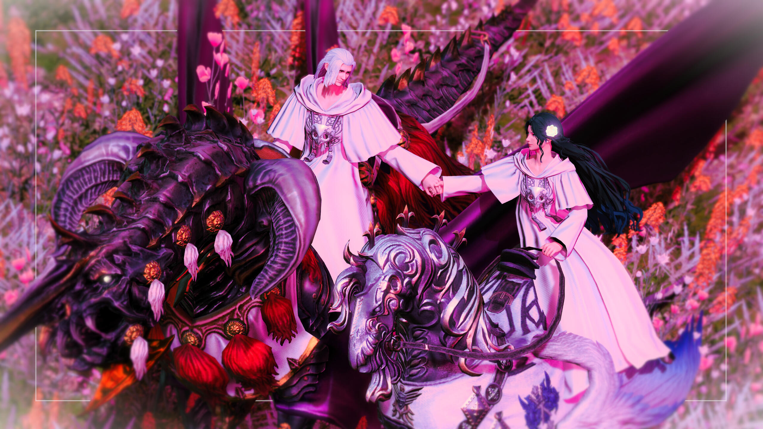 There is a rare but special partnership some few privileged Ancient souls experience called soul bonding. Though the phenomenon puzzles even the most knowledgeable scholars of Etheirys, it is an undeniable bond that's born of the purest love, respect, and adoration. Their souls would reach out to one another in a warm embrace, coalescing together to share each other's emotions and experiences in the most beautiful way. It is believed that this love transcends time itself. Persephone and Hades are two such souls that finally understand this tug at their souls after Hades ascends to the seat of Emet-Selch. For many years did their love blossom, that admiration for each other's differences and strengths flourishing akin to a beautiful bloom. For Persephone, it was his compassion for their star and his sentimental heart that drew her to him. As for Hades, he fell in love with the brightness of her soul and her strong convictions. He now wears one of her signature earrings, each bearing one of the pair for their newfound partnership. To say the least, Hythlodaeus is not shocked at all by these turn of events.