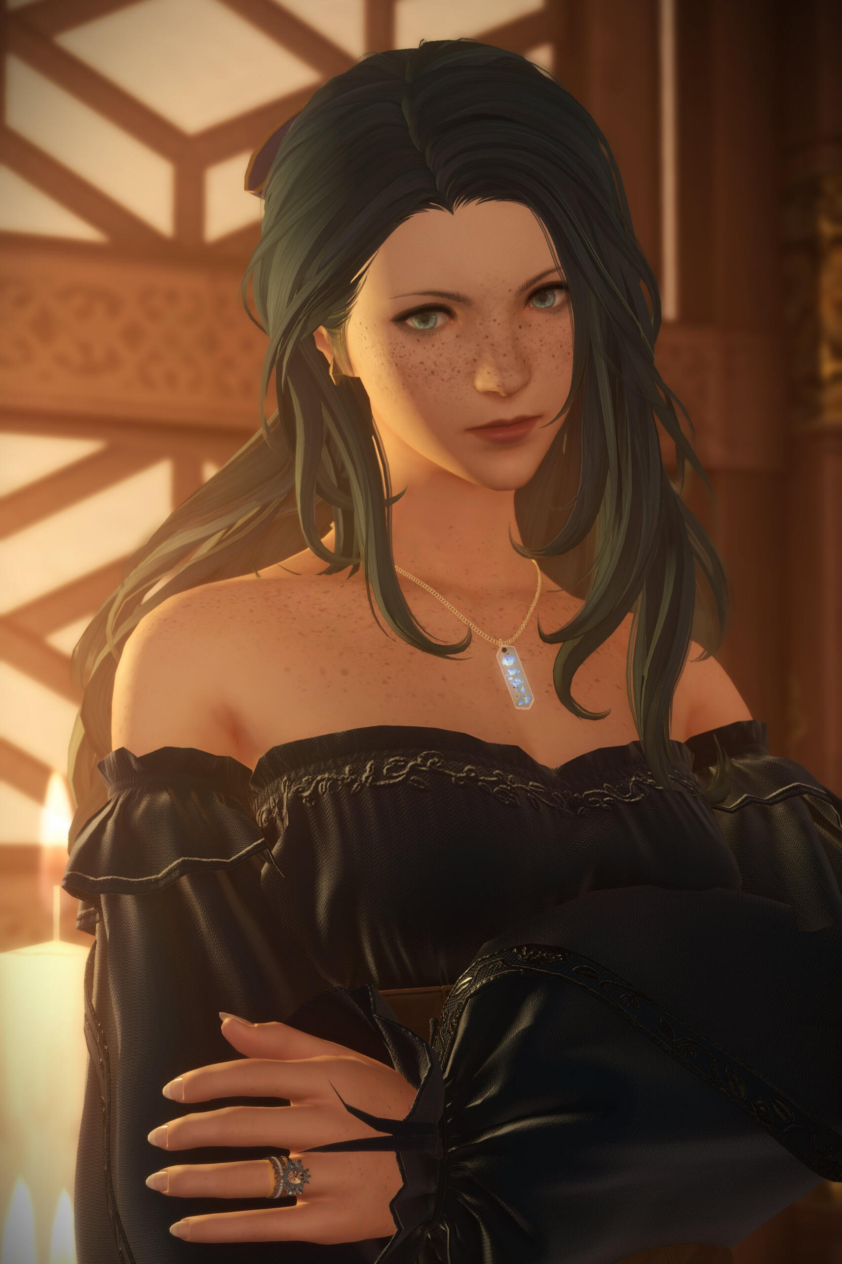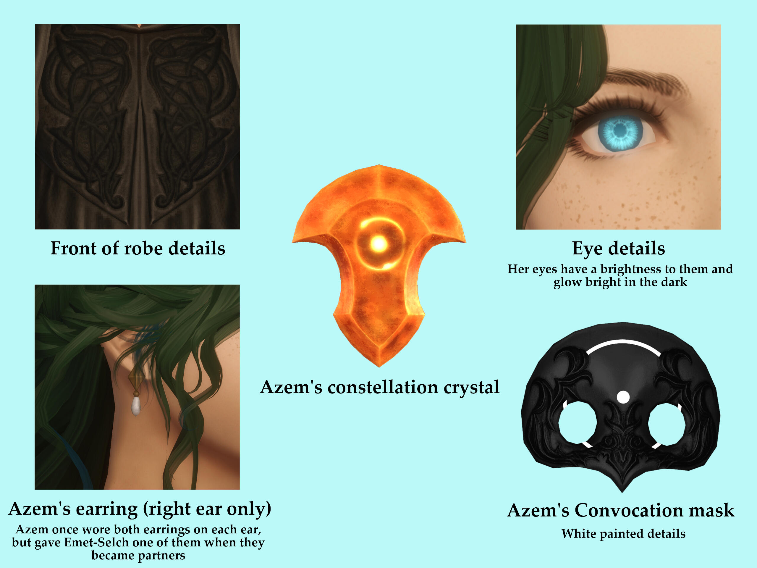 Who was she truly? Was she Gemma? Or was she Persephone? The memories that felt like they were both hers and not hers plagued her mind. She was wrought with grief and mourned Hades, but none of her comrades could understand why. It was Thancred she turned to at her lowest point, her trust all but crushed from what Urianger and the Exarch had planned. The torture from the absorption of the light was something that still haunted her. Elidibus is her enemy now, and she can only somberly think of what she would have to do. Forced to kill the last of the unsundered, she nearly gives herself over to her inevitable death until the invocation of a sunset hued crystal gives form to Hades. "Herein I commit the chronicle of the traveler. Shepherd to the stars in the dark. Though the world be sundered and our souls set adrift, where you walk, my dearest, fate shall surely follow. For yours is the Fourteenth seat - the seat of Azem." And so she will always remember, for he entrusted the star to them in his final moments. After they successfully return home to the Source, it is Aymeric she opens up to about the events of the First. If anyone could understand her grief and confusion over her identity, it was he.