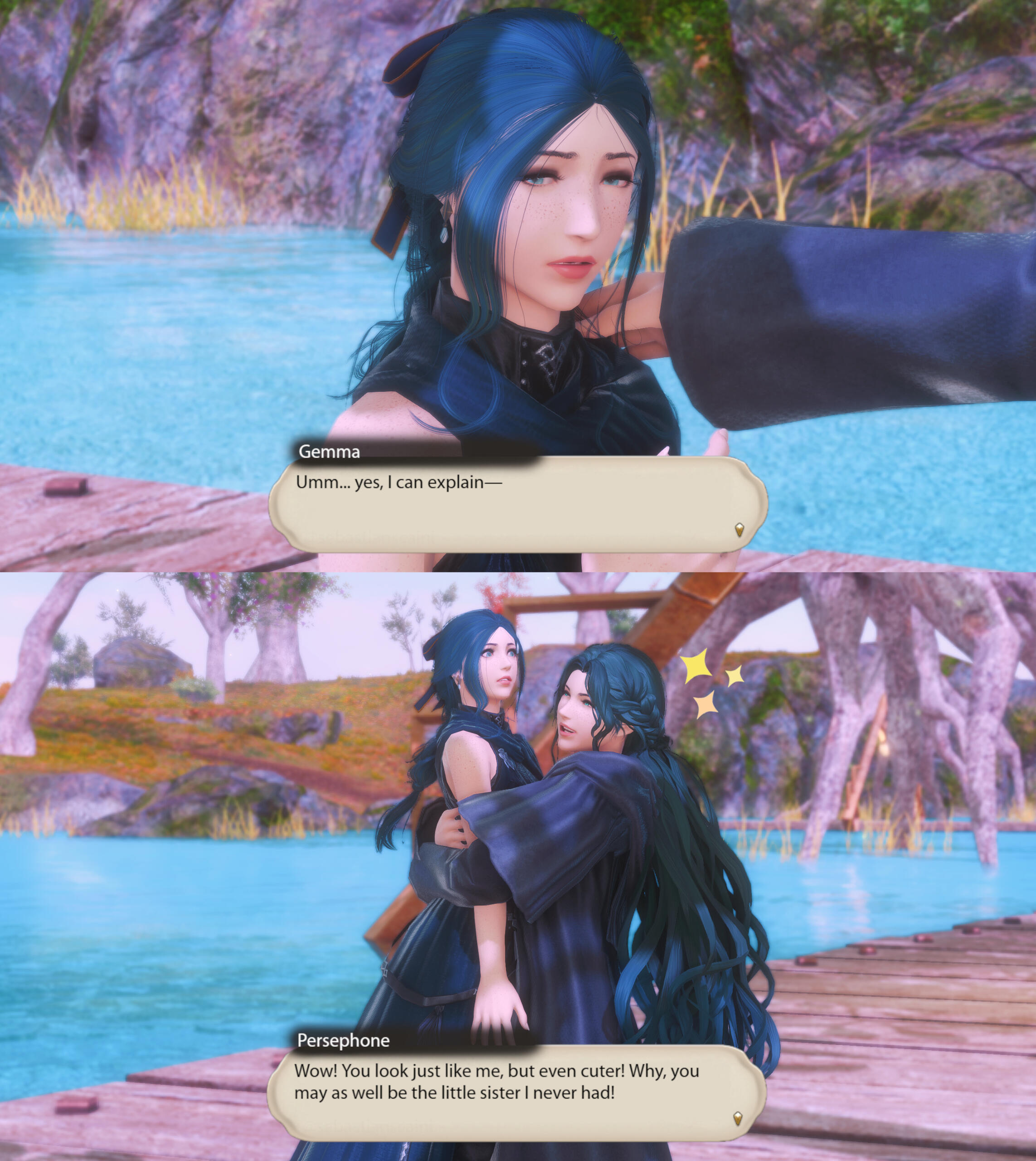 Gemma has much love for Alisaie, and the same is the case in reverse. At first, Gemma found herself intimidated by Alisaie's bold and fiery personality, especially towards her twin brother. But their relationship naturally blossomed during their time in Othard and they've been close friends ever since. Alisaie, however, doesn't appreciate Gemma's more motherly instincts towards the young elezen.