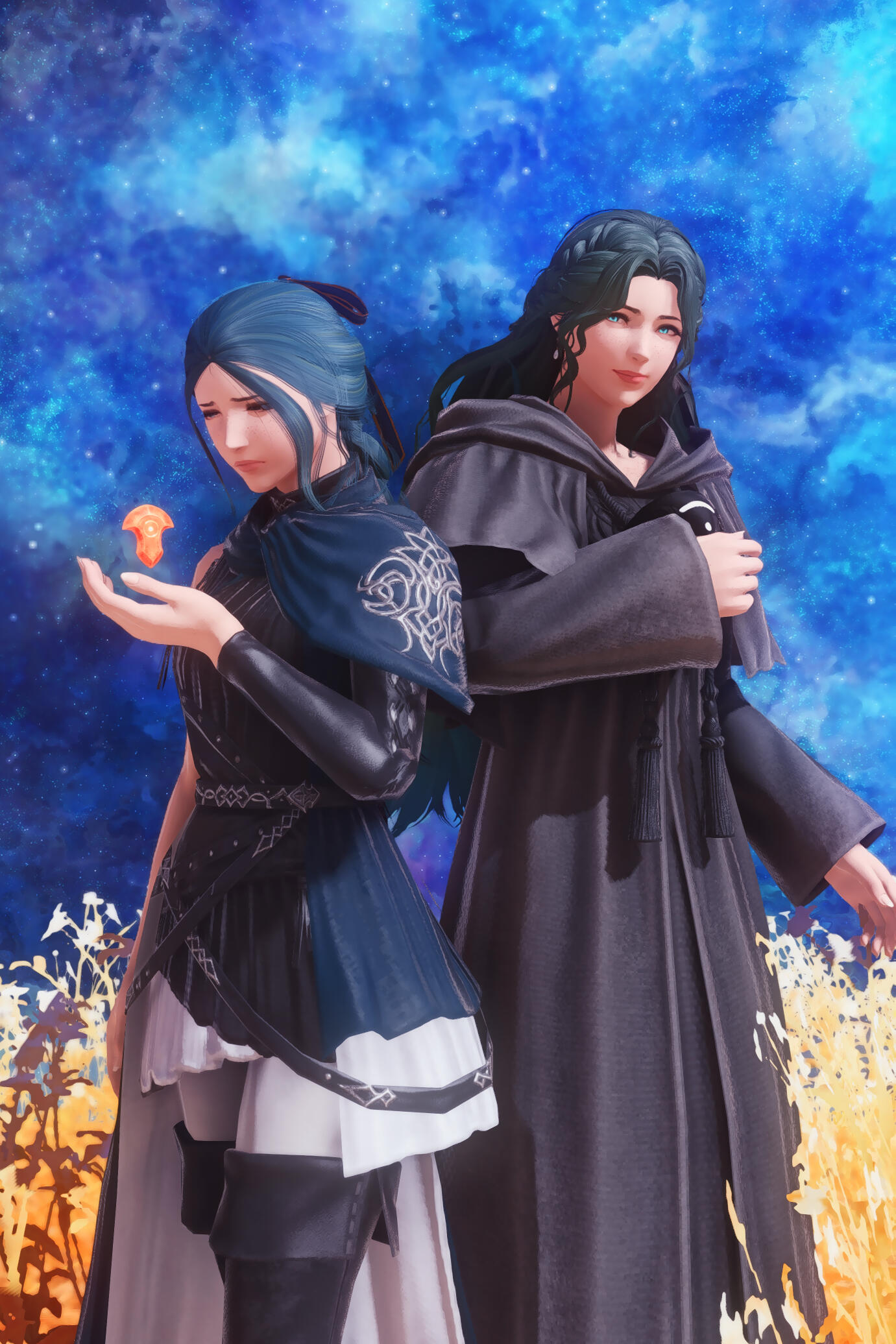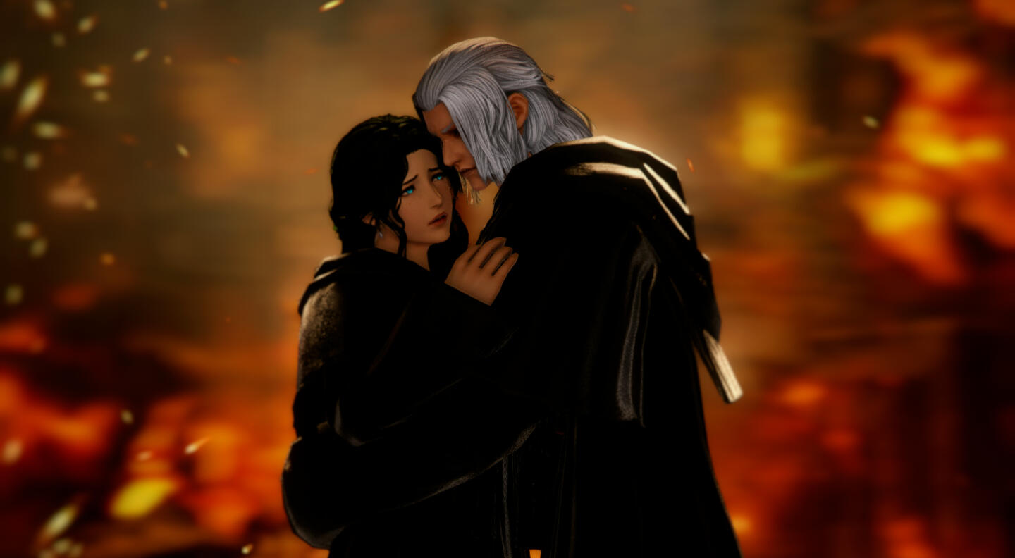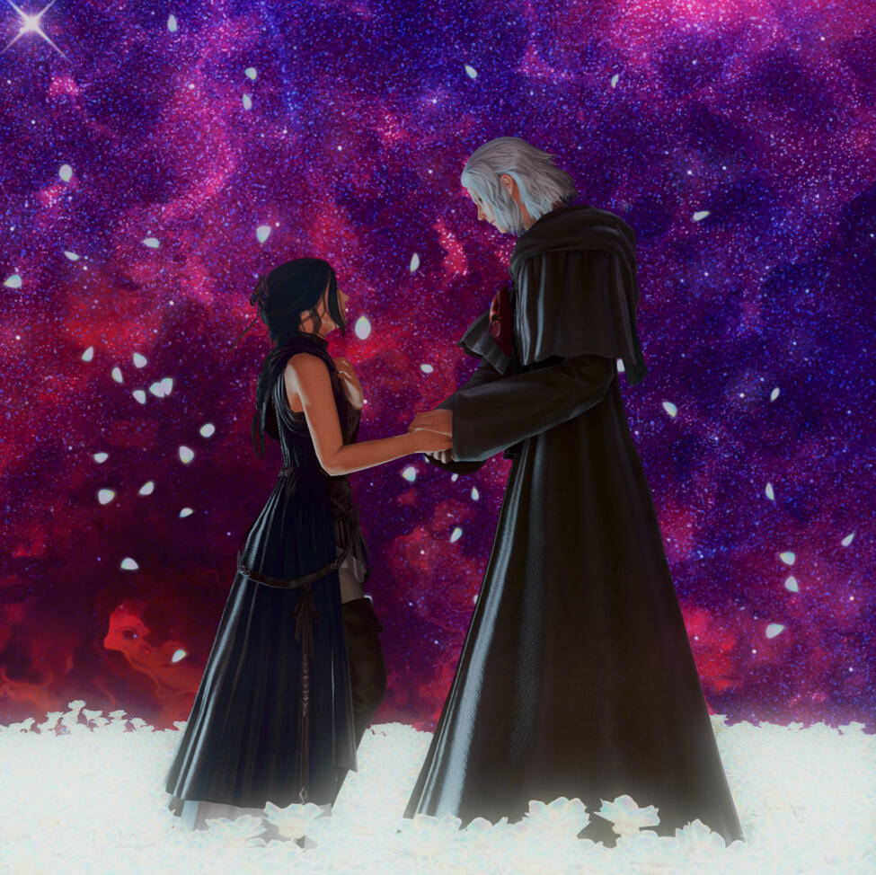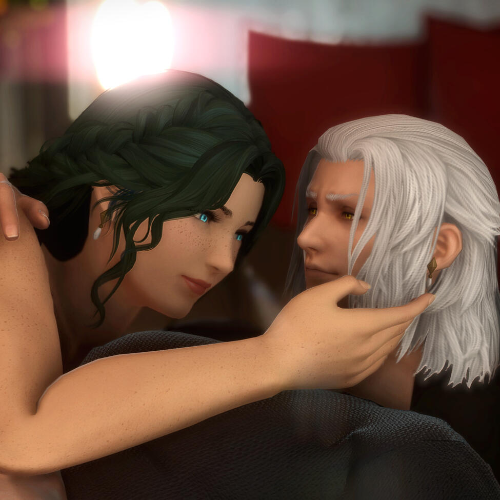 Gemma is 32 plus some moons when she arrives in the First and meets the Ascian, Emet-Selch. From the moment she first sensed his presence, she'd felt a strange pull at her chest as though her soul were reaching out towards the Ascian. Yet why, she could not understand at first. But as she continued to kill the Lightwardens of the First, she only felt herself more drawn to him. And the pieces slowly began to come together - a world long ago now forgotten, the origin of both Hydaelyn and Zodiark, and the sundering of their very souls. The realization that she was once the unsundered soul of his soulmate, now his enemy, is a bitter twist of fate. Yet their goals would never align, and she could not remember who she once was, much to his anger. And so he pushed her to fight him as Hades, both their titles cast aside, where one would become the victor and the other the villain. But in his final moments after his defeat, he bid her to remember them with a whisper of the true name of her unsundered soul. And in a flash, all the memories of her life with him came back in a rush. Their happiness. Their partnership. Their love. But it was too late, for he dissipated in her arms to the aetherial sea.