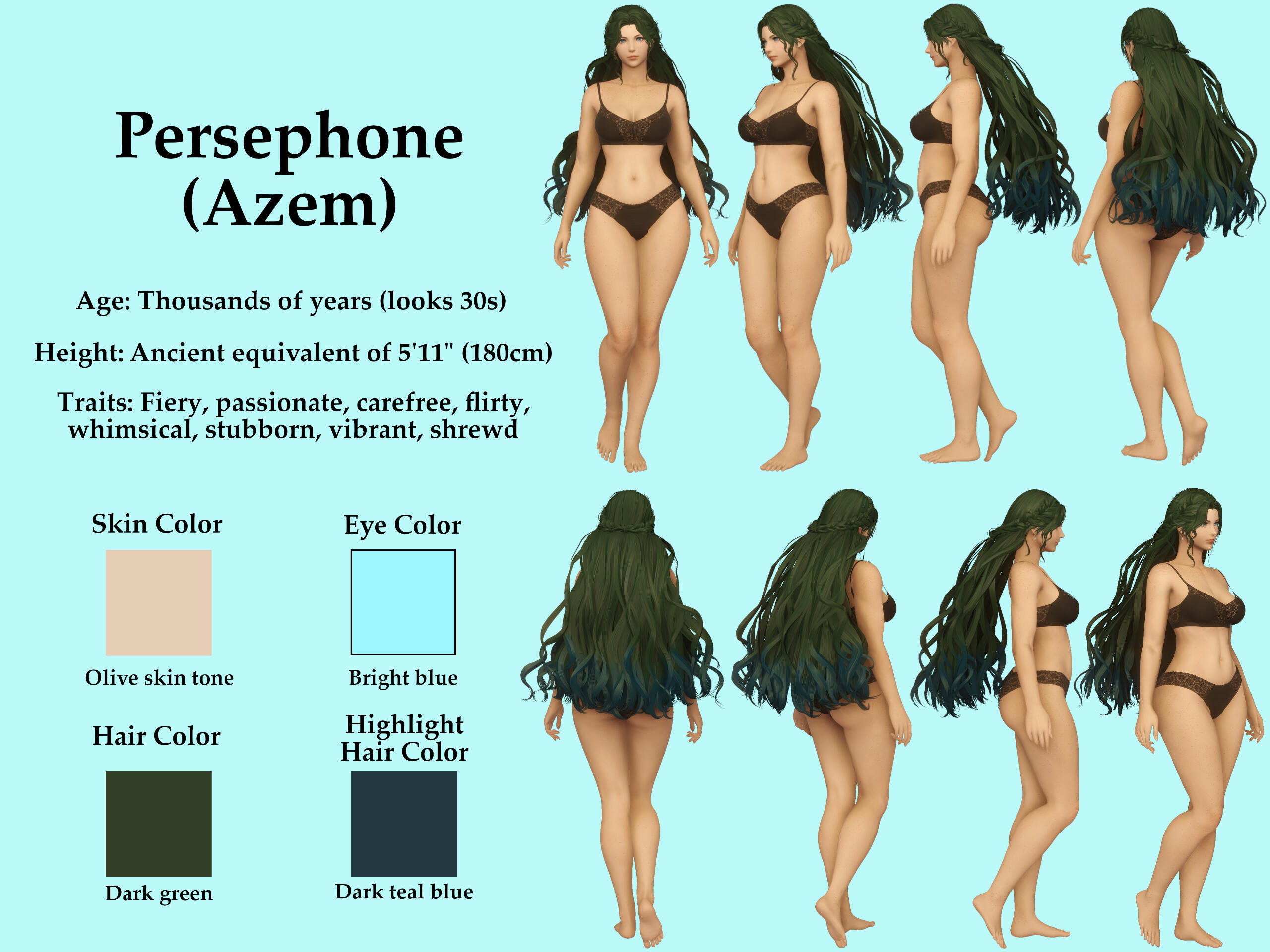 Gemma and Hades's second daughter who, like Zagreus, holds a whole and unsundered soul. She is the spitting image of her mother with the exception of her hair color and lacking her mother's freckles. A clever, intelligent, and whimsical soul, she looks up to what her mother did as the Warrior of Light. They have a mutual respect for one another while also loving each other dearly.