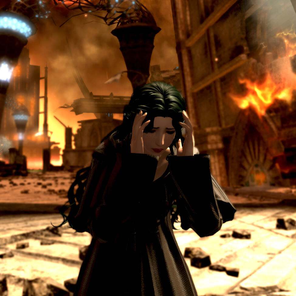 A calamity that would be called the Final Days befalls their star and spreads all across the lands. The Convocation of Fourteen tries to find a solution to the catastrophe in Amaurot while Persephone travels Etheirys to gather any information she can. She fights with all her strength to protect the people, but the calamity spreads quickly through the negative emotions twisting their magicks to create beasts of nightmares. Despite all their efforts, no one can find the root of the spread. A plan is formed to summon a being of immense power to rewrite the laws of the land, and Persephone is vehemently against it when she realizes how many people would sacrifice themselves for the summoning. But the Final Days reaches Amaurot, and still she refuses to participate in the summoning. She implores Hades to reconsider, but he's made up his mind to side with the Convocation. Zodiark is born, and Persephone is wrought with grief at the loss of so many lives - including Hythlodaeus. She resigns from the seat of Azem and plans to leave Amaurot, but not before one final meeting with Hades who begs her to stay by his side. Yet their tears and pain would not sway her, and she leaves her love behind, vanishing in the night.