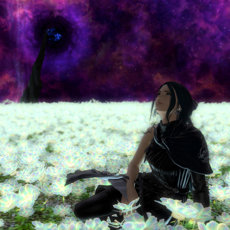 Six moons on the Source have passed since she journeyed to the First, and with the Final Days looming, she travels to Sharlayan in search of the answers on how to stop the coming calamity. On her journey, she speaks with a ghostly figure of a woman in white who rings very familiar to her. It is Hydaelyn that bestows upon her a gift - a bright bloom that will guide Gemma on her journey. In her travels through Sharlayan, Thavnair, Garlemald, and Mare Lamentorum, she finds the flower blooming a different hue with the array of emotions she experiences. Joy, friendship, acceptance, and gratitude. But Fandaniel's plans come to fruition when he takes the place of Zodiark's heart, forcing her to strike down the weakened ancient primal. The Final Days were upon them, Zodiark's power in stagnating the corruption lost. With Thavnair burning from the horrors of the calamity, she has to find the answers within the "Elpis" bloom. She speaks to Elidibus in the Crystal Tower of the First, and in recognition of the bloom's name, bids her to travel to the past unsundered world to find the gentle Hermes. But it was not just he who she would cross paths with.