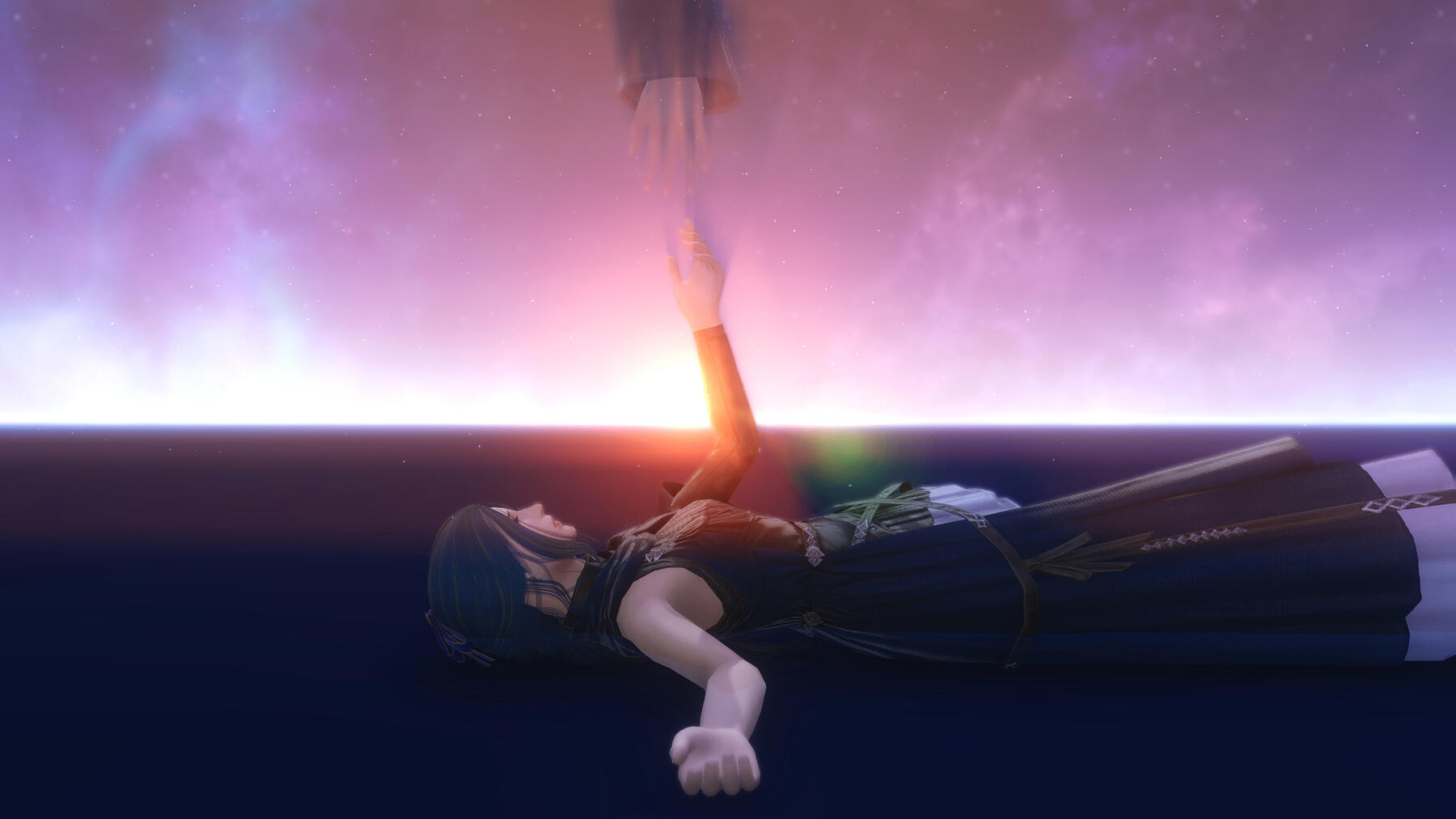 Persephone has wandered the star for many years after the Final Days were averted. Venat finds her one day watching the city from afar, and the two speak for the first time in so long. But before Venat leaves, she speaks cryptically, telling the young mentee: "Save Emet-Selch." Remembering how Venat's followers approached her to participate in another summoning, Persephone rushes to Amaurot when she realizes what is about to happen. She finds Hades and begs him to escape into the tear Venat spoke about. But he is at a loss and can't understand the urgency of her words - the love of his life who'd left him, harbored so much sorrow and anger over, had returned to him. A summoning begins over Amaurot, and Hydaelyn deals her devastating blow to Zodiark that would sunder the world. Persephone forces Hades into the tear with Lahabrea and Themis who are nearby, and they end up in the void. With grief, they look upon their star and people sundered into shards. But Persephone did not survive the devastation, and in her last moments held within the arms of Hades, shatters into fourteen shards after bidding him to remember her.
